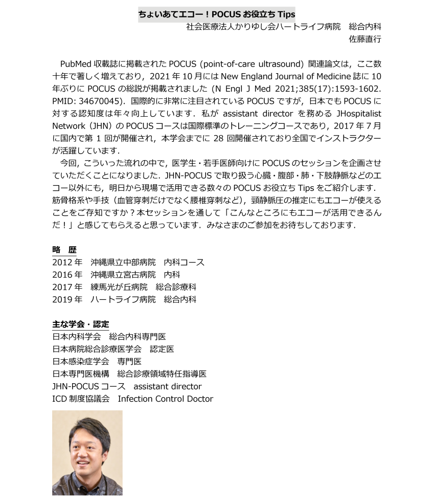 また、「頭痛診療」、「発達障害と認知症」、「睡眠」をテーマとした講演、国際的なエコー検査(POCUS)の紹介も行います。