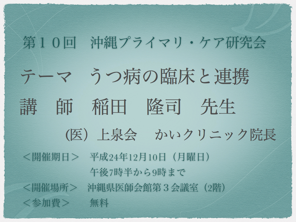ストレスの多い現代、うつ患者さんを診療する機会は益々増えています。抗うつ薬の使い方、精神科医にすぐに引き継ぐ症例、非定型うつ、双極性障害、自殺企図などについて検討したいと思います。参加ご希望の方は、下記沖縄プライマリ・ケア研究会事務局まで(opcjim@ml.nakamoto-plan.com)ご連絡下さい。