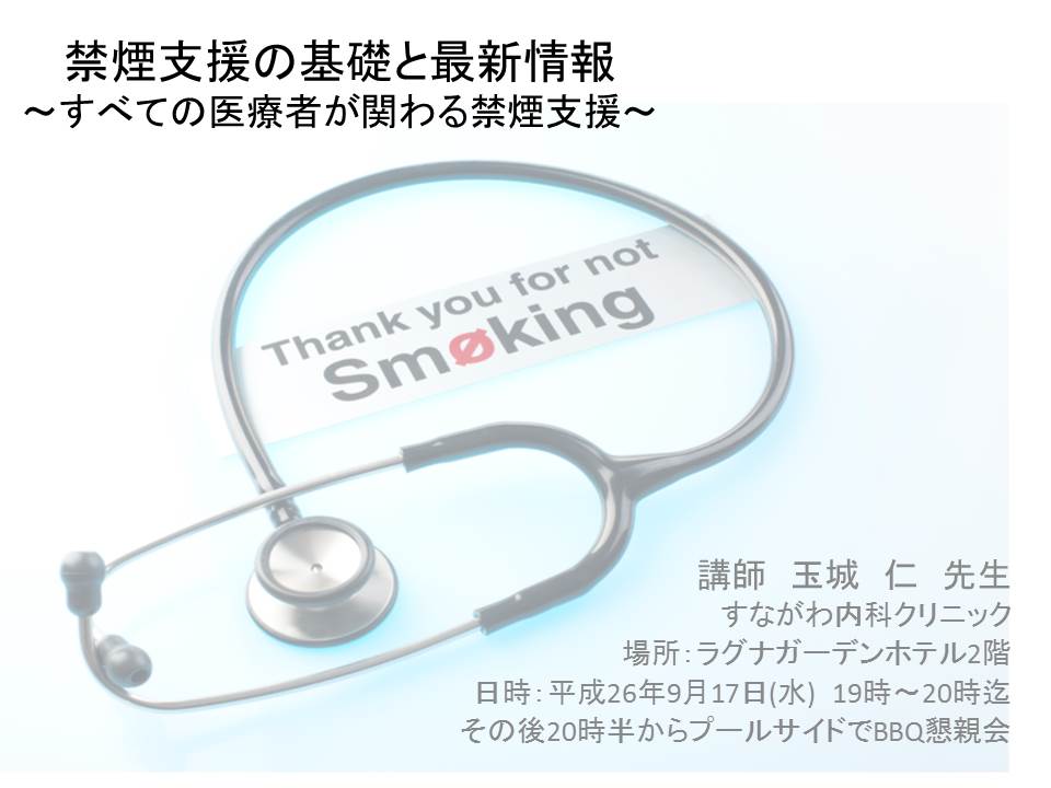 今回は、すながわ内科クリニックの玉城仁先生を講師にお迎えして、禁煙支援について考えます。