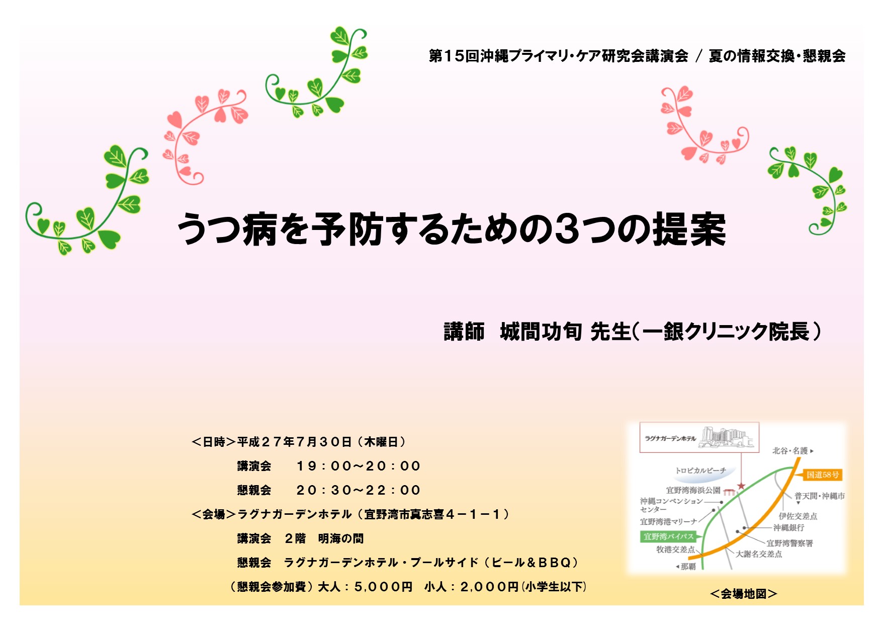 ストレスの多い現代、うつ患者さんを診療する機会は益々増えています。抗うつ薬の使い方、精神科医にすぐに引き継ぐ症例、非定型うつ、双極性障害、自殺企図などについて検討したいと思います。参加ご希望の方は、下記沖縄プライマリ・ケア研究会事務局まで(opcjim@ml.nakamoto-plan.com)ご連絡下さい。